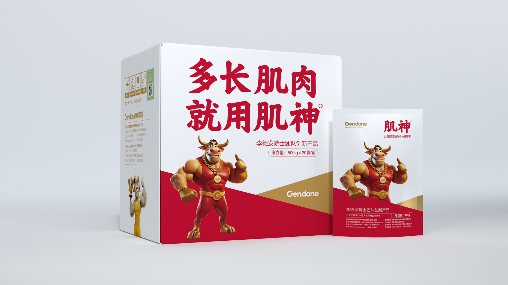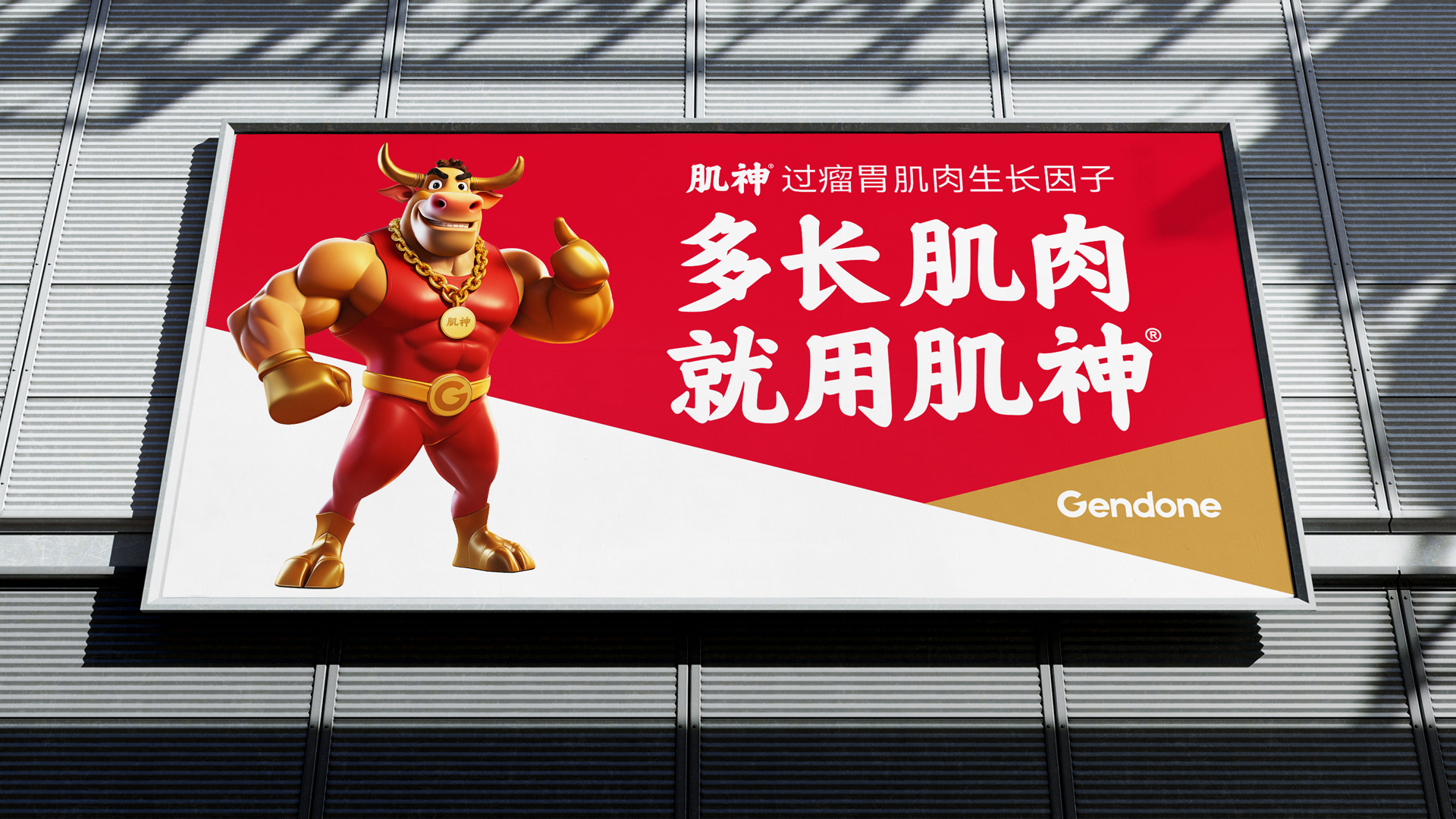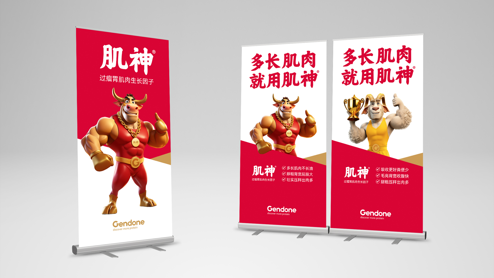 为使品牌价值可感可知,我们为肌神®打造专属拟人化超级IP形象。基于“神级角色”共识,我们创造了肌肉饱满、威猛挺拔的肌神®牛超级IP形象、羊毛下隐现力量线条的肌神®羊超级IP形象。并在形象中融入金牌、金腰带等冠军元素隐喻“冠军级成果”,设计自信点赞手势构建互动记忆点。肌神®IP形象极大地降低了品牌的记忆与传播成本,让品牌自身成为强大的沟通载体。
