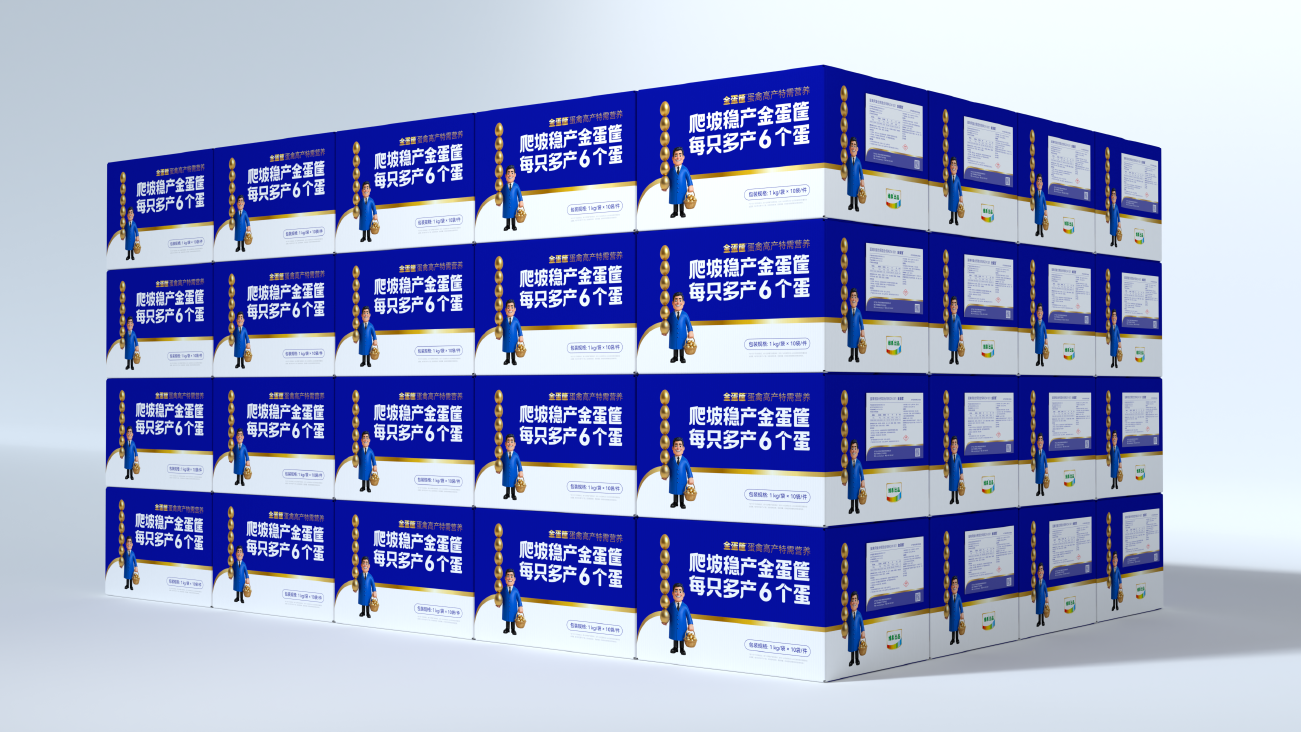 最终是打造秒级的认知逻辑。围绕“每只多产6个蛋”这一核心,我们建立了全方位协同的认知系统。超级传播语“爬坡稳产金蛋筐®,每只多产6个蛋”,将场景、品牌与收益强力绑定。手托六枚金蛋的养殖者超级IP形象,将价值承诺变得戏剧化、可感知,辅以专属的“财富金”与“价值蓝”色彩体系,构建了过目不忘的品牌符号。与此同时,从包装到“金蛋随手记”小程序,再到全套线下营销工具,我们确保了客户在每一个触点接收的信息都清晰一致,让“好卖”拥有坚实的落地支撑。